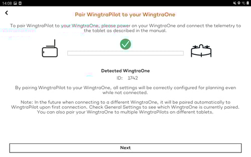 - Pair WingtraPilot and WingtraOne. Once it is done click next.