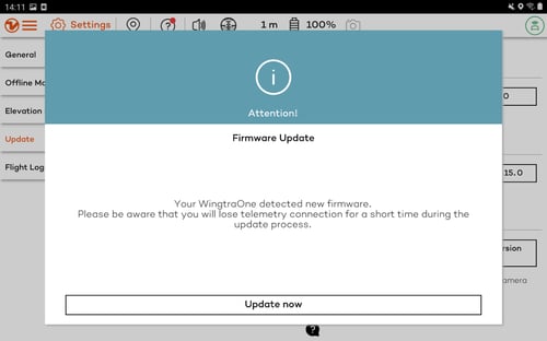 - WingtraPilot will lose the telemetry connection for about one minute during the update process. Important: Do not shut down the WingtraOne during the update process.