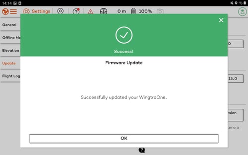 - WingtraPilot will let you know when the update was successful. By clicking on OK, you finalize the update process.