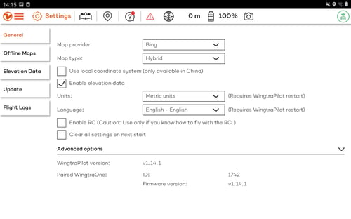 After you are done, double-check the WingtraPilot and the firmware version your drone is running on, by clicking on the General tab under Settings. Make sure that they are the same.