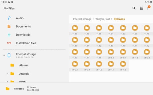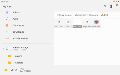 All installation files of previous releases that you need to do the downgrade (.apk and .tar files) are stored in the internal storage of the tablet within WingtraPilot/Release folder.
