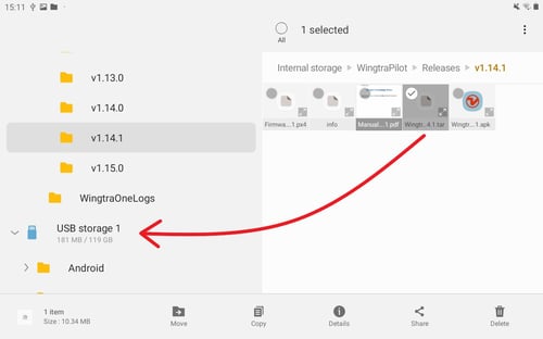 - Copy the .tar file from Internal storage/WingtraPilot/Release/v1.XX.X to camera SD card root folder. Do it by selecting the file first and by dragging and dropping it to USB storage 1.