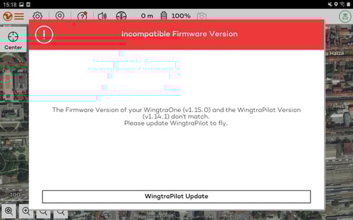 - Once connected, the Warning Incompatible Firmware Version pop up message will appear. Click Update WingtraPilot.