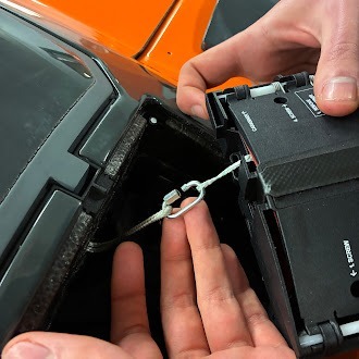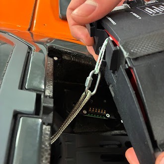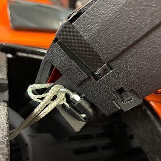 - Hold the two tethers on one side of the carabiner and slide it back into the slot on the side of the parachute module